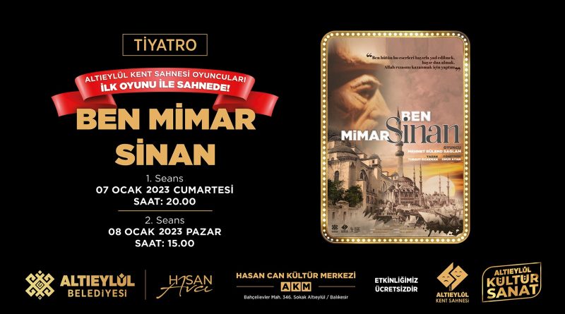 DevamBen Mimar Sinan…Altıeylül Belediyesi bünyesinde faaliyet gösteren Altıeylül Kent Sahnesi, Ben Mimar Sinan adlı tiyatrooyunu ile perdelerini açıyor.Kayseri’nin Ağırnas köyünden