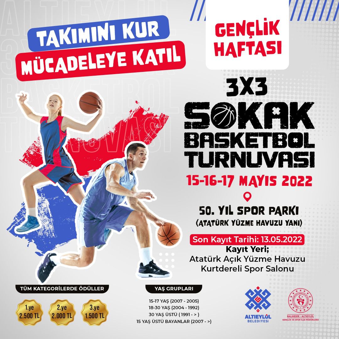 Pandemi koşulları sebebiyle uzun süredir ertelenen birçok etkinlik, kısıtlamaların yavaş yavaş kaldırılması ve gelen bahar ayı ile birlikte gençlerle buluşmaya devam ediyor. Gençlik Haftası etkinlikleri kapsamında düzenlenen turnuvalar ile gençleri spora teşvik ederken mücadele ruhunu ve sağlıklı yaşamı da benimsemelerini hedefleyen Altıeylül Belediyesi, özellikle genç nesilden büyük takdir topluyor. 50. Yıl Spor Parkı’nda düzenlenecek olan etkinliklerde 3×3 Sokak Basketbol Turnuvası ve 4×4 Voleybol Turnuvası’nda mücadele edecek gençleri tüm kategorilerde çeşitli para ödülleri bekliyor. 3×3 Basketbol Turnuvası’nda kendi kategorisinde 1’inci olan takım 2500 TL, 2’nci olan takım 2000 TL ve 3’üncü olan takım ise 1500 TL’lik ödülün sahibi olurken; 4×4 Voleybol Turnuvası’nda kendi kategorisinde 1’inci olan takım 2400 TL, 2’nci olan takım 1800 TL ve 3’üncü olan takım da 1200 TL’lik ödülü almaya hak kazanacak.