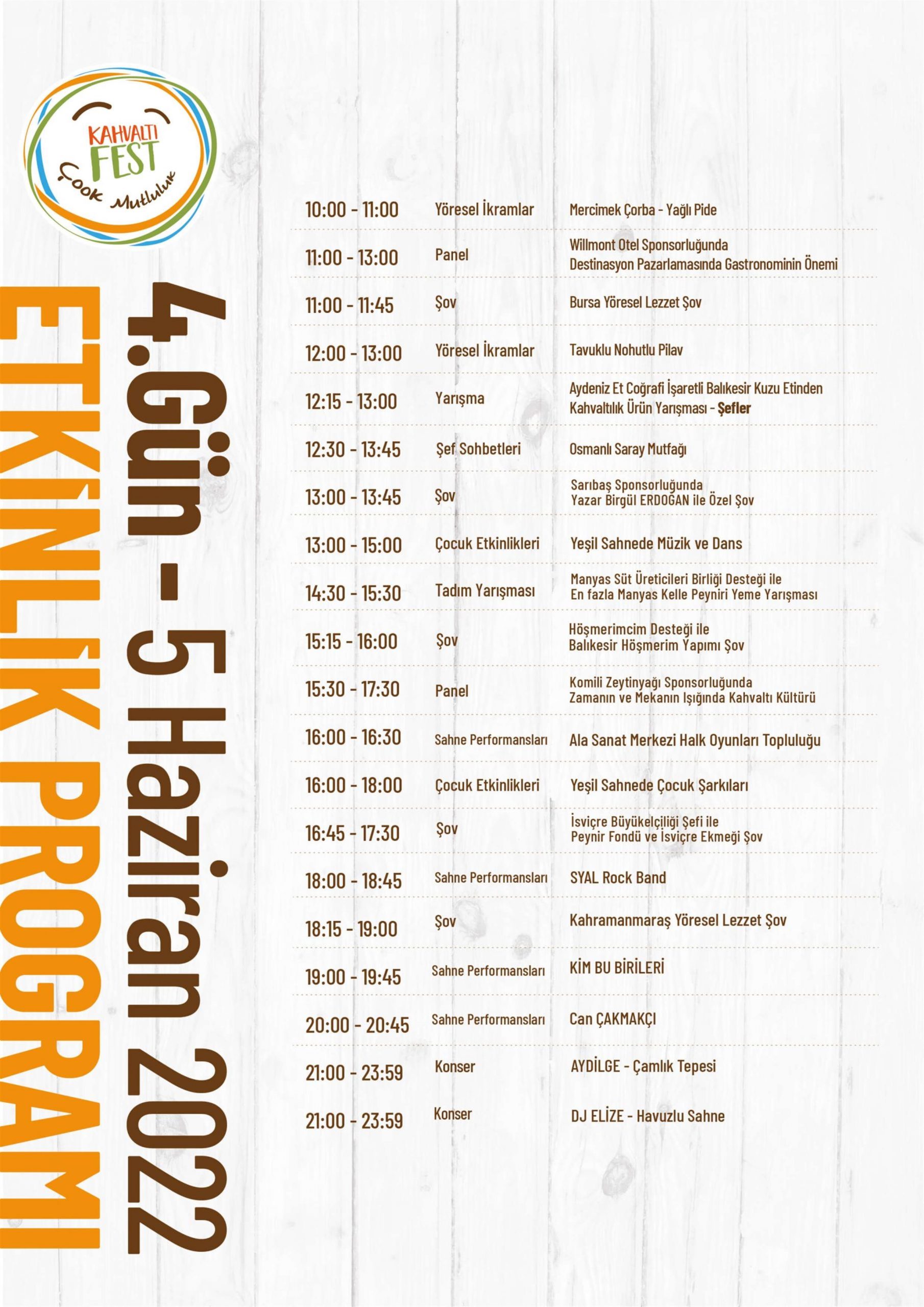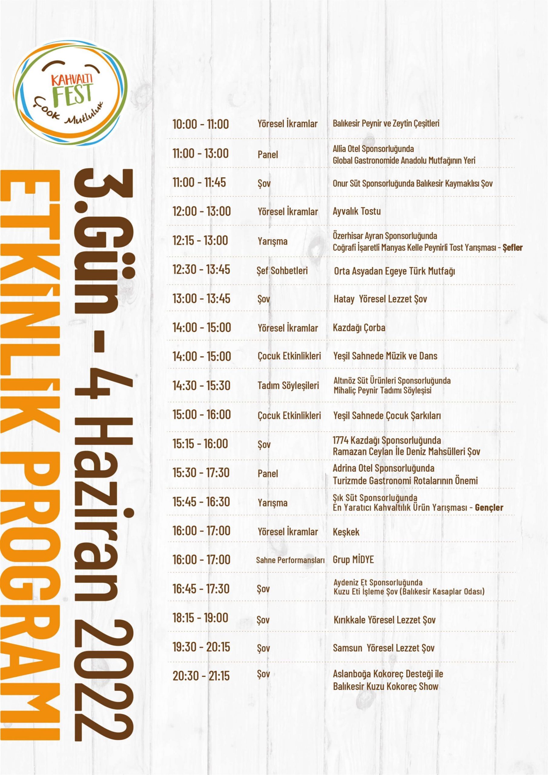 4 günün dolu dolu geçeceği festivalde; dünya ve ülke çapında isim yapmış birbirinden başarılı şefler, Balıkesir’in ürünleriyle lezzet şovlar gerçekleştirecek. Balıkesir Kahvaltısı’nın yanı sıra yöresel lezzetlerden; Balıkesir Kaymaklısı, Höşmerim, Ayvalık Tostu, Susurluk Tostu, Susurluk Ayranı, Keşkek, Kokoreç, deniz mahsulleri, mezeler, Mercimek Çorbası, Etli Çorba, Kazdağı Çorbası, Düğün Çorbası, Buğday Çorbası, Yağlı Pide, Balıkesir Lokması, Tavuklu Nohutlu Pilav, zeytin, zeytinyağı, peynir, ekmek ve reçel çeşitleri ikramları gerçekleştirilecek.