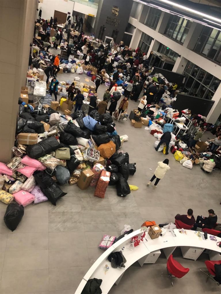 vatandaşların belediyeye ulaştırdığı acil yardım malzemeleri toplama noktalarından TIR’lara
