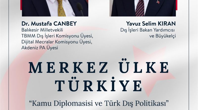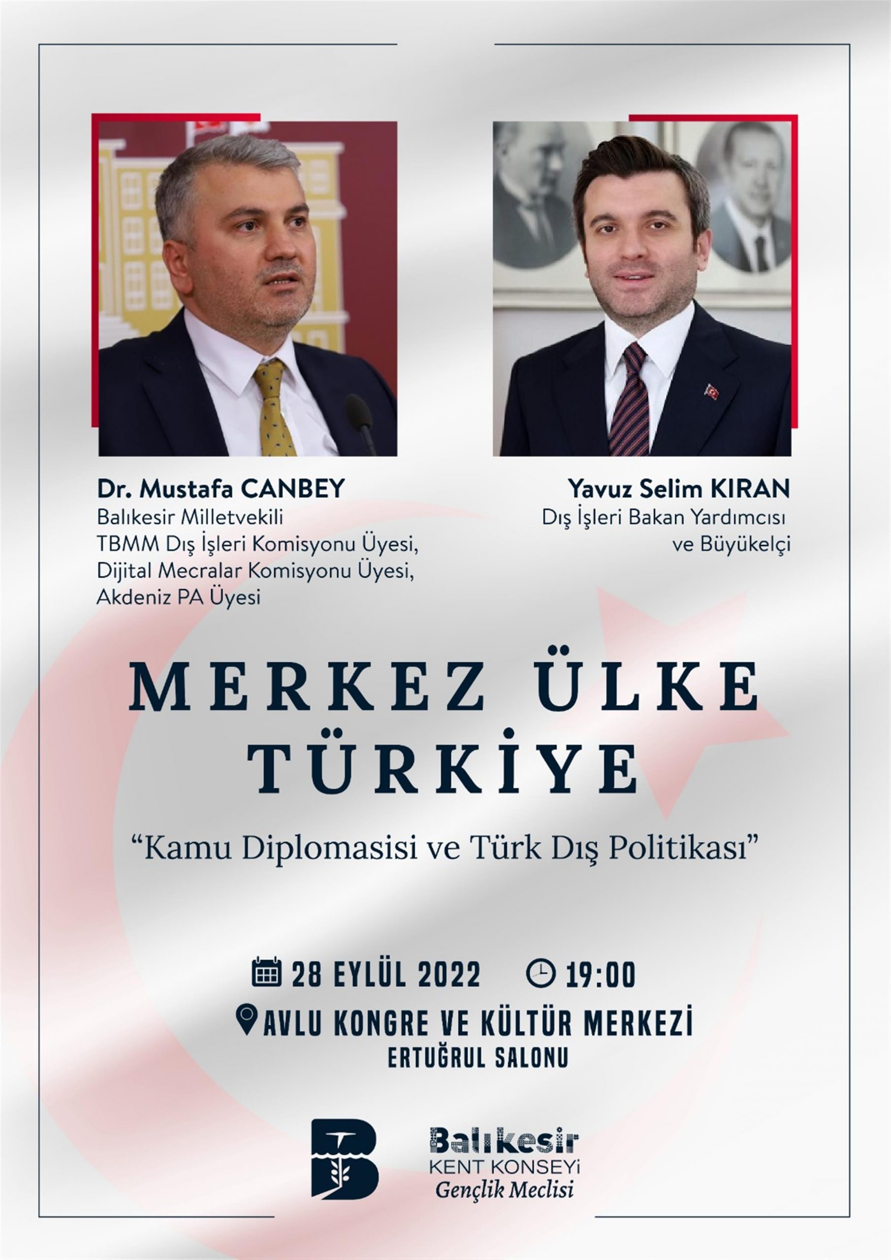 Dış İşleri Bakan Yardımcısı Büyükelçi Yavuz Selim Kıran ile AK Parti Balıkesir Milletvekili Dr. Mustafa Canbey “Merkez Ülke Türkiye” konulu söyleşide, 28 Eylül Çarşamba günü Avlu Kongre Merkezi’nde gençlerle buluşuyor. Programda; kamu diplomasisi ve Türk dış politikası detaylı olarak ele alınacak.