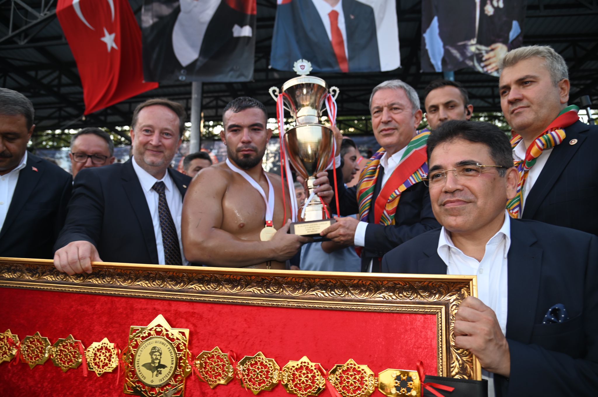 Güreşlerde ilk 3’e giren başpehlivanlara ödüllerini Milli Savunma Bakanı Hulusi Akar, Türkiye Odalar ve Borsalar Birliği (TOBB) Başkanı Rifat Hisarcıklıoğlu, Balıkesir Valisi Hasan Şıldak verdi.