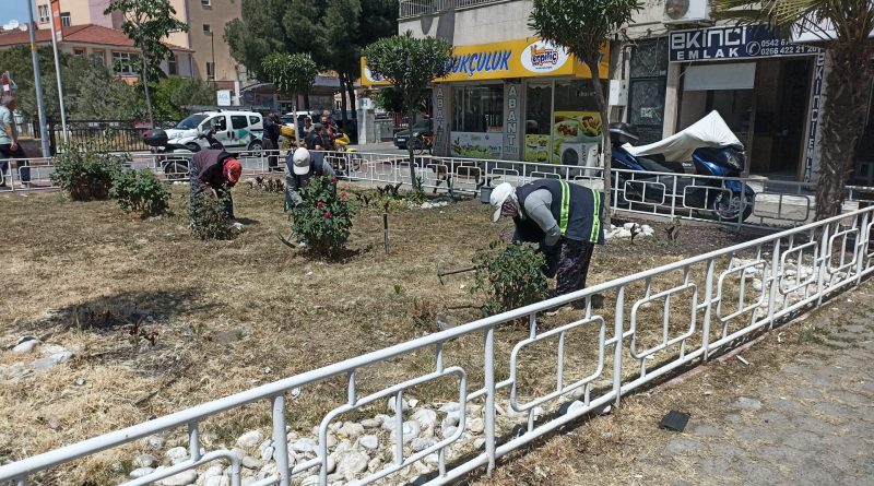Burhaniye’de yabani otlar belediye tarafından temizleniyor.